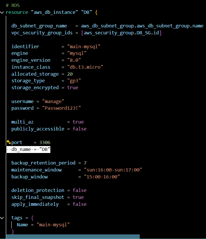 APP -> RDS(MYSQL 3306) 으로 DB작성