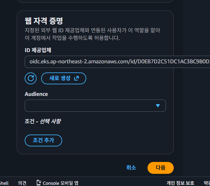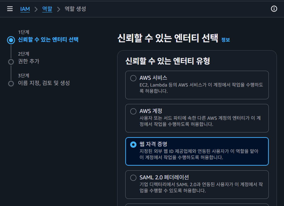 Create Role -> Web Identity -> Identity Provider 삽입 -> Githup REpo를 조건으로 넣는다